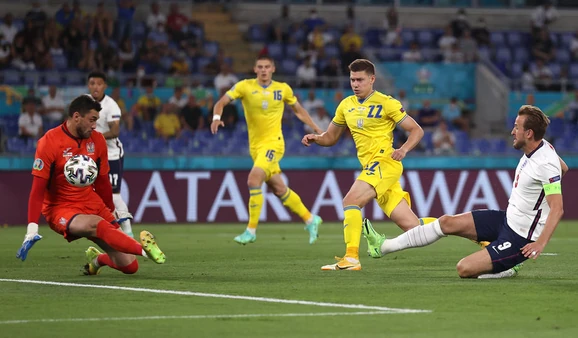 Kolo - 03072021 2100 Ukrajina-Engleska 04. Minuta i udarac posle greške Vokera golman Pikford je sproveo u korner. Fudbal Ukrajina Engleska.